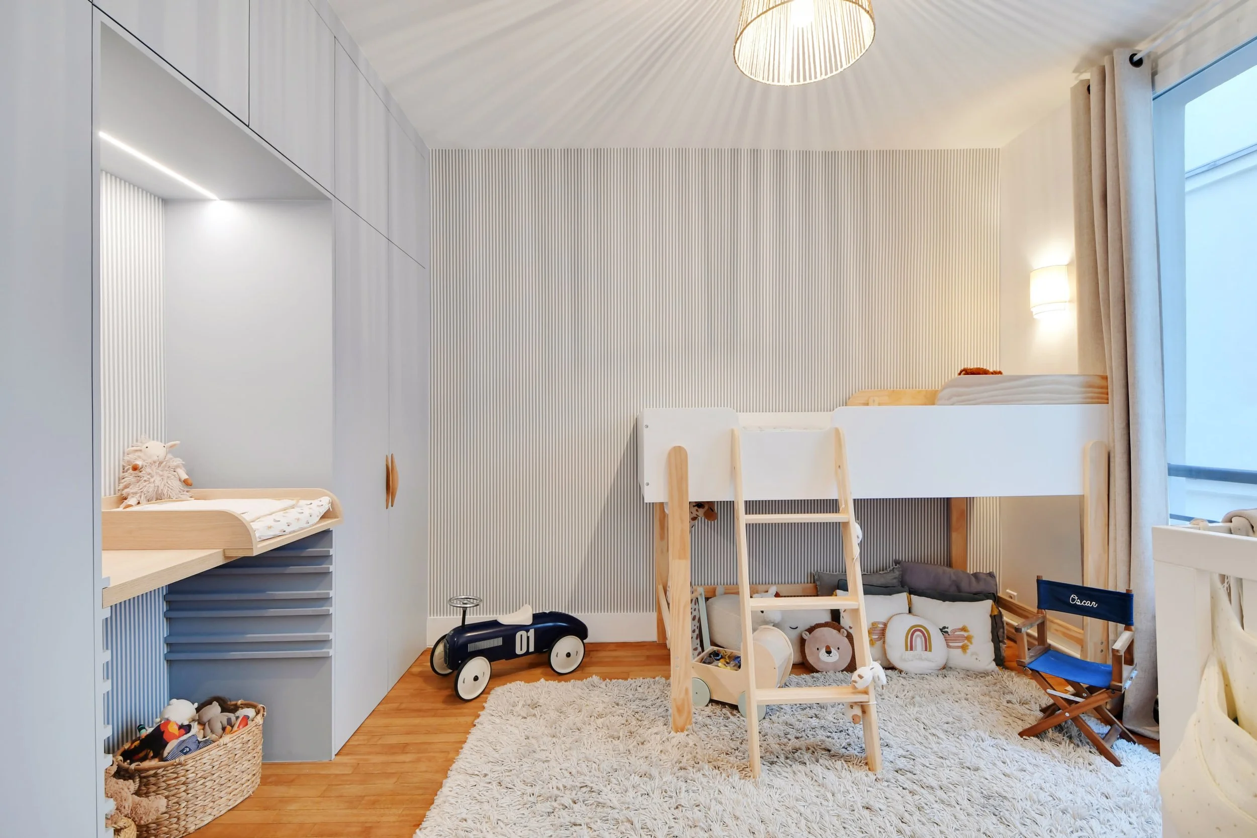 Ce T4 de 93m2 a été entièrement repensé afin de le rendre plus fonctionnel et adapté à leur vie de famille. Un travail important a été mené sur le mobilier sur-mesure afin d’optimiser les espaces et doter l’appartement de rangements dont il était auparavant dépourvu. La cuisine a été entièrement repensée afin d’être à la fois pratique et conviviale ; l’essence de bois choisie pour les façades fait écho à celle du mobilier sur mesure du salon, ce qui crée une harmonie d’ensemble. Une des chambres a été repensée afin d’être transformée en suite parentale, intégrant un dressing sur mesure et une petite salle d’eau. La salle de bains a également était transformée afin d’y inclure une douche spacieuse, une baignoire d’angle et un coin buanderie.